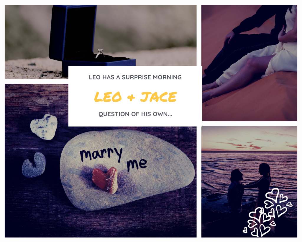 “You know I love you, too.” She snatched her ring, and after bouncing up and down, gripped him tightly. “Yes, yes, yes! I can’t wait to be Mrs. Leo. Ha, ha! One day…” Leo twirled his Jace around. “One day suits me fine.”