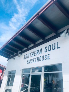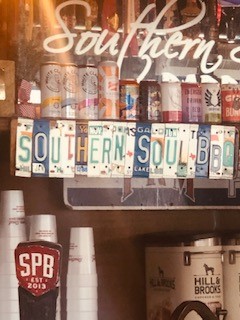 Southern Soul BBQ (btw, I’m not getting paid to blurb this place, just writing whatever comes out). It’s BBQ at a former gas station, in a roadside curve, rural-cool decor (you know, forks and spoons in Mason jars, license plates and old ad posters on the walls), scrumptious Brunswick stew.