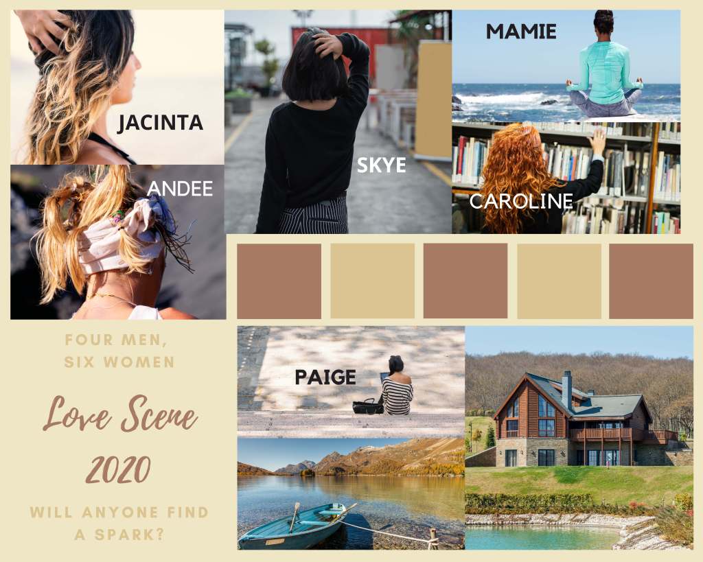 *Each character has separate bedroom quarters and all of them are invited to co-mingle in plain view in the great room, kitchen, dining area, or on the open porches/shores of the lake house. These writing scenes of all characters will also be included each week, so you know what they’re up to.